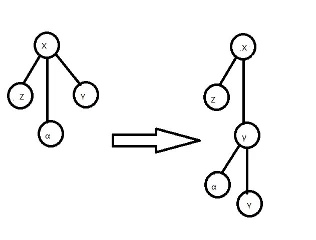 Rake 操作指定一个度为 \(1\) 的点 \(x\),而且与点 \(x\) 相邻的点 \(y\) 的度数需大于 \(1\),设点 \(y\) 的另一个邻点为 \(z\),我们将点 \(x\)、边 \(xy\) 的信息放入边 \(yz\) 中储存,并删去它们.如图所示.