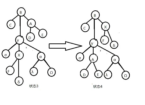 若 \(x\) 的爷节点有一个右儿子,则将点 x 和爷节点的右儿子互换,更新信息,然后退出.