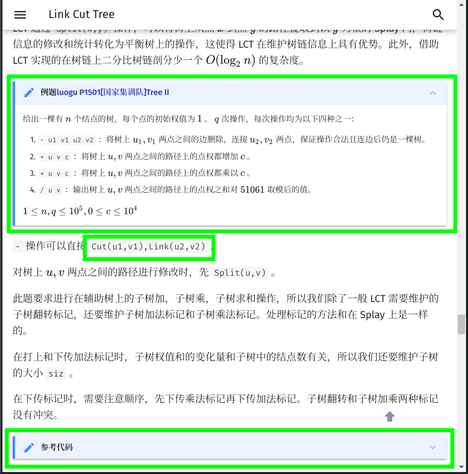 使用 MkDocs 扩展语法,让例题题面与算法描述区分开.将代码折叠,可以让文章更紧凑.(毕竟看 Wiki 的大多数是了解思路,除了模板代码需要阅读外,习题的代码大多可以折叠.)在描述函数操作时,使用行内代码和 LaTeX 公式都是不错的选择.