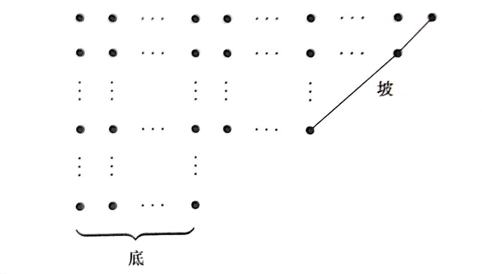 画出每个互异分拆的 Ferrers 图.最后一行称为这个图的底,底上点的个数记为 \(b\)(Bottom);连接最上面一行的最后一个点与图中某点的最长 \(45\) 度角线段,称为这个图的坡,坡上点的个数记为 \(s\)(Slide).
