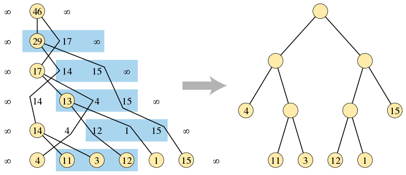 如上图所示,在算法的第一阶段,通过查找合并输入序列的无序三元组构建的二叉树(左侧),和算法输出的正确排序的二叉树,其中叶子高度与另一棵树一样.